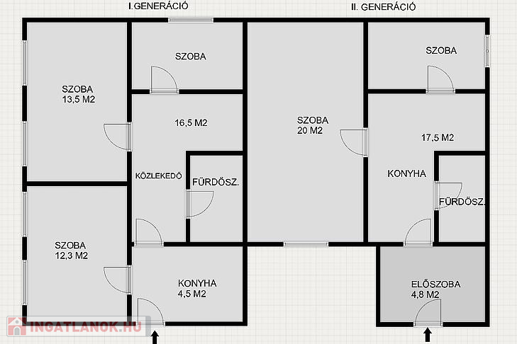 Az I. generáció 48 m2, konyha, nappali, 2 szoba és fürdőszoba található itt.