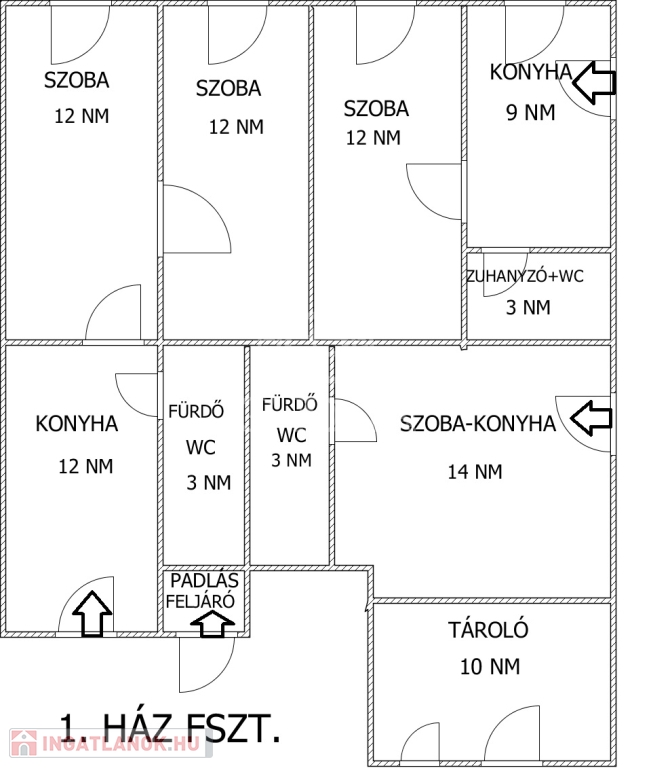 fekvésű, 3 házrésszel rendelkező, 200 nm-es, 9 szobás, konyhás,