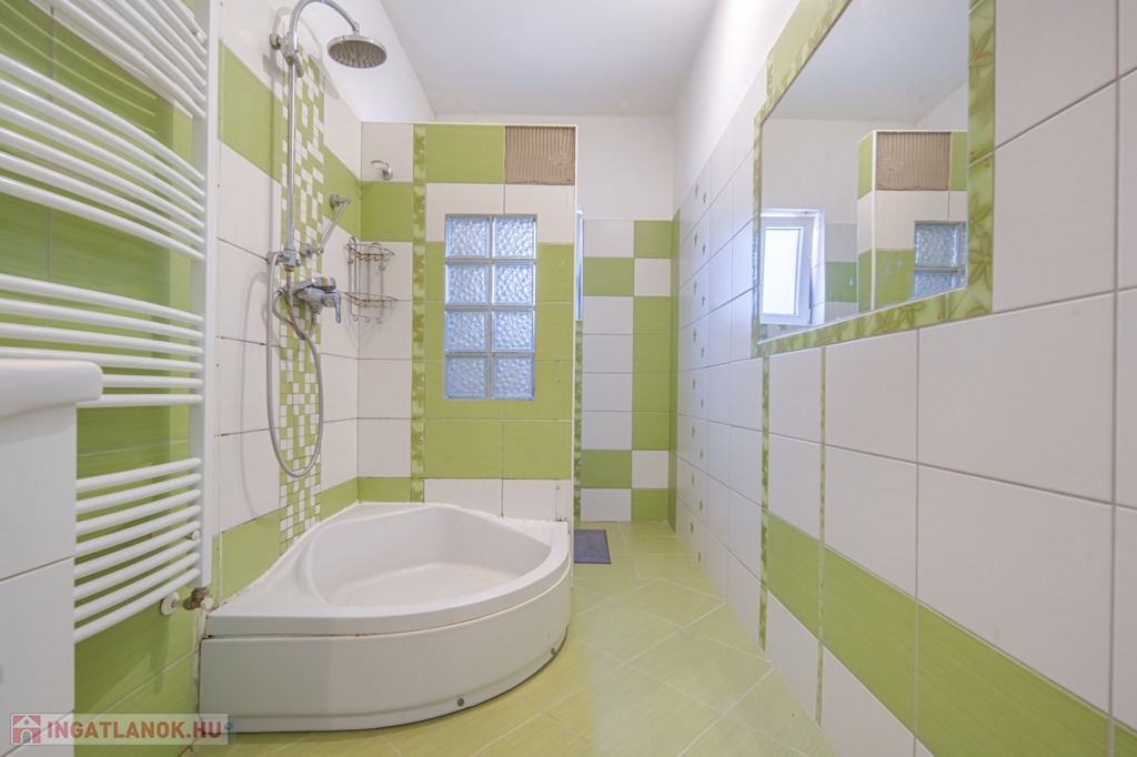 Az alsó és a felső szinten is teljes értékű fürdőszoba található, lent külön, fent egy helyiségben a WC-vel. Lent található háztartási helyiség is. A 4 hálóból egy dolgozó, 3 pedig nagy méretű, teljes értékű, de a dolgozó felől található a műhely, mely irányába könnyen bővíthető a szoba, így a ház mind az alsó, mind a felső szinten.
