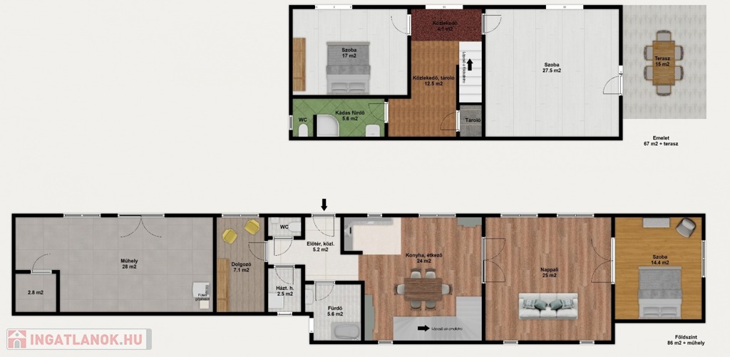 Az emeleten az utcafront felé a hálószobából nyílik egy 15 m2-es terasz, valamint a műhely mögött is található 12 m2 teraszrész.