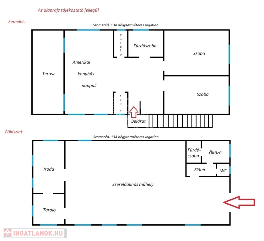 Az alsó szinten aknás, telephelyengedéllyel rendelkező műhely, iroda, fürdő, wc: 139 m2 alapterületen.