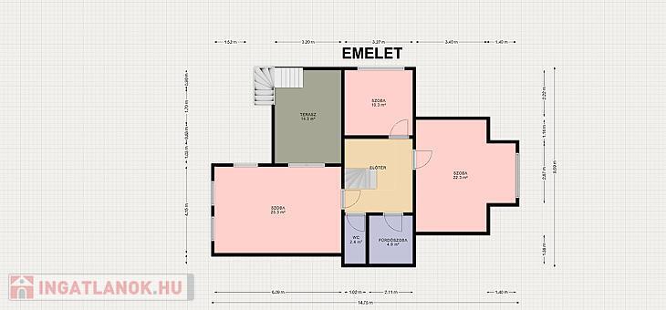 Emelet: 116 m²-en 3 hálószoba, 20 m²-es terasz, fürdőszoba, külön mellékhelyiség és előtér található.