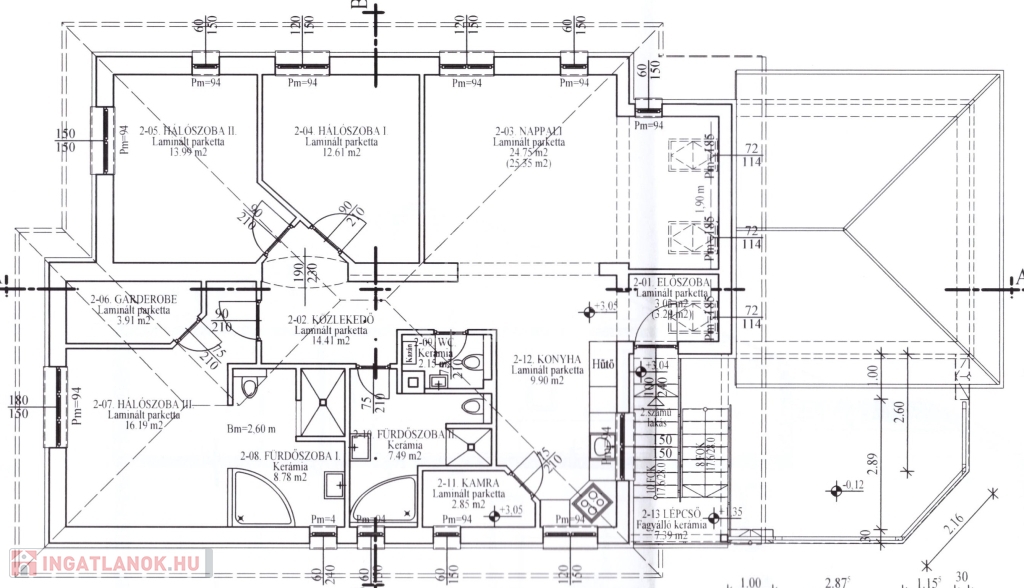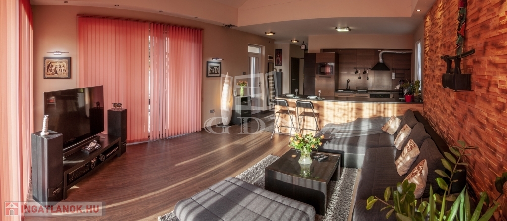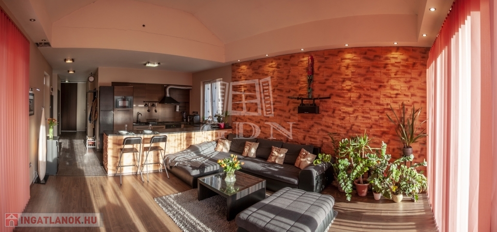 3. EMELETI LAKÁS: 121nm lakóterületű, mely nappali, konyha, 3 hálószoba, 2 fürdőszoba, mellékhelyiség, gardrób, tárolóhelyiség kialakítású, azonban a nappaliból feljutva a tetőtérbe megoldható további 2 szoba kialakítása is.