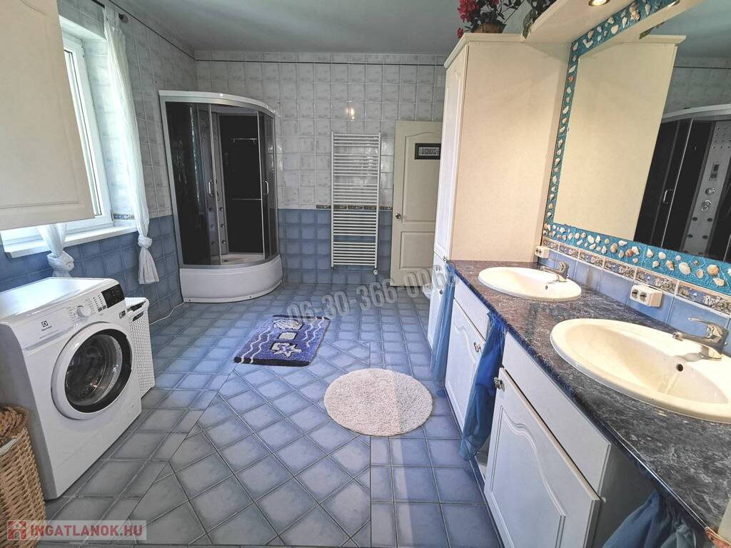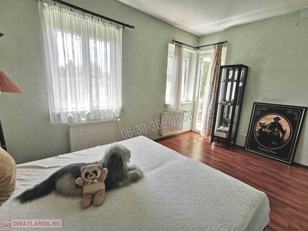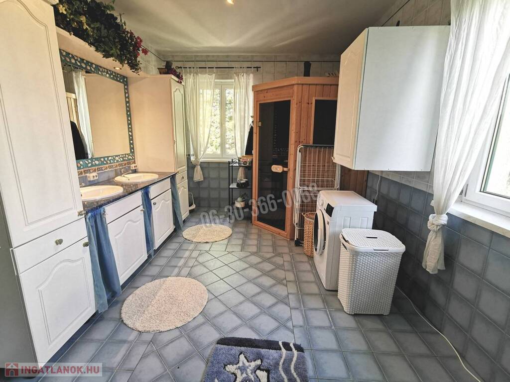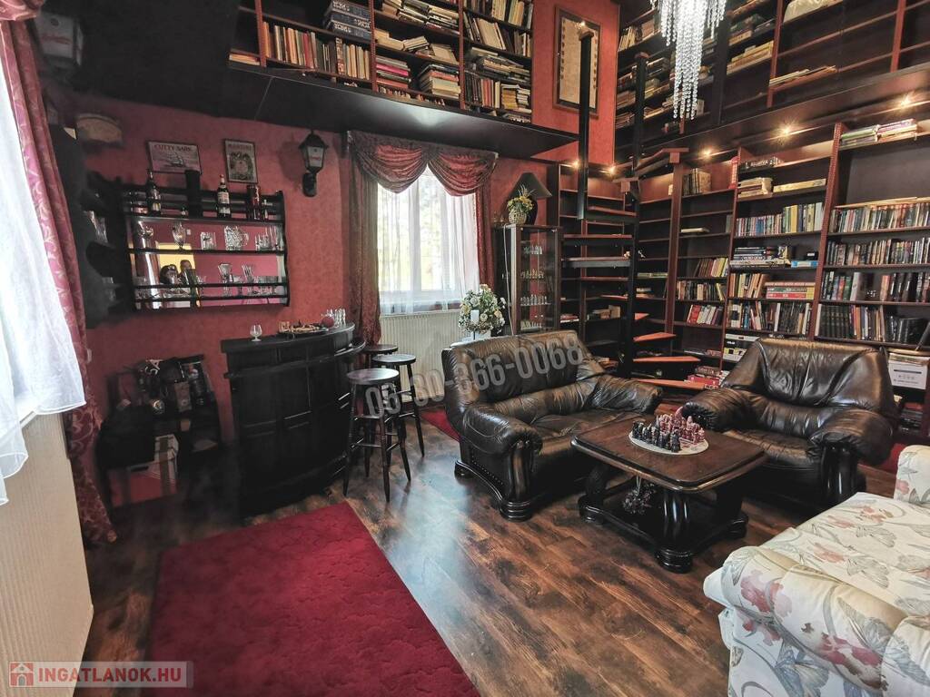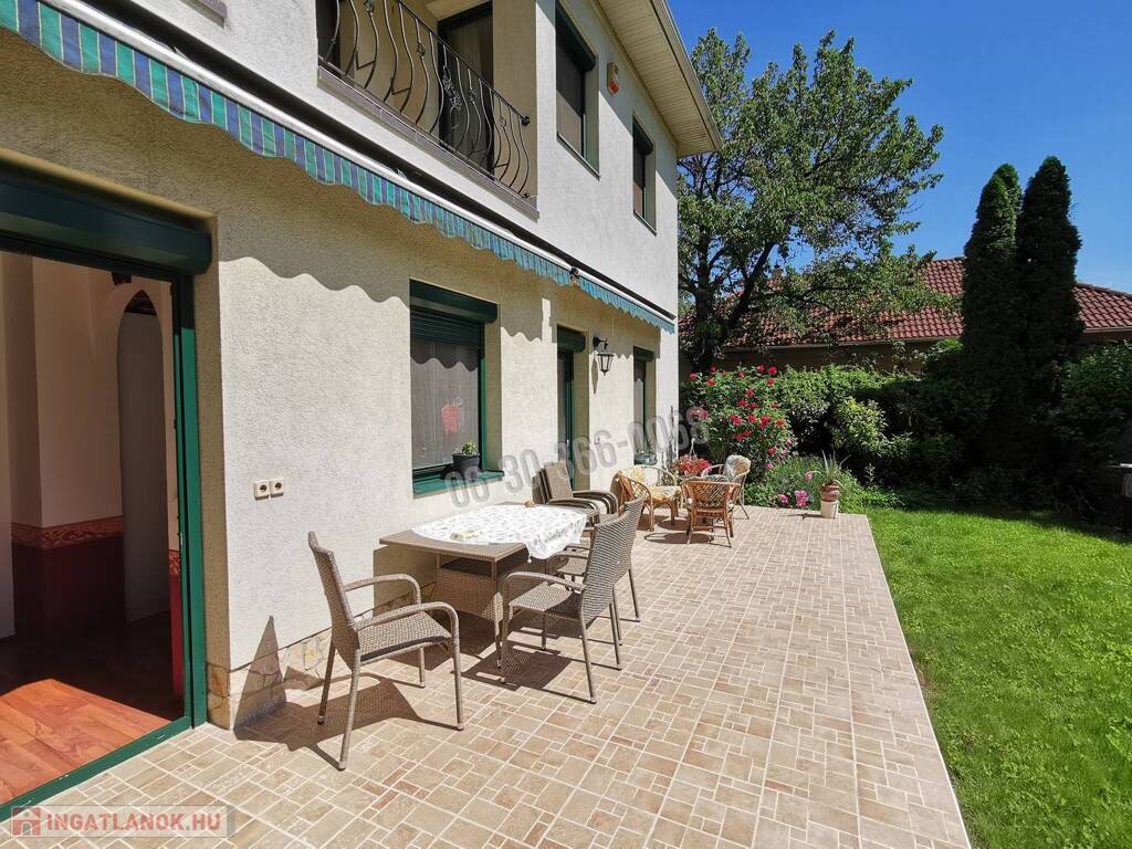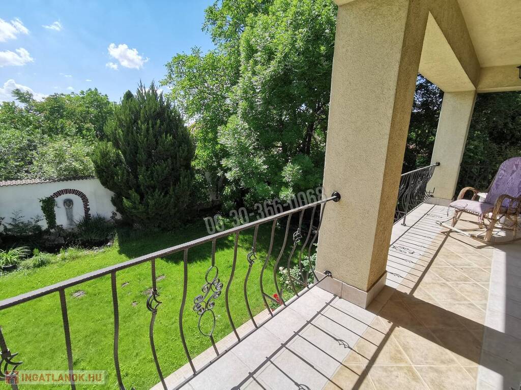 Az emeletes, részben alápincézett ház összes alapterülete 414 nm, a lakóterület 330 nm, a pince 84 nm. A háromgenerációs ház 7 szobával és egy 5.4 méter belmagasságú, körgalériás, kandallós könyvtárszobával, 2 konyhával, 3 fürdőszobával, 3 különálló WC-vel és 2 gardrób szobával rendelkezik. Az egyik tágas fürdőszobában szauna is beépítésre került. Riasztóval felszerelt.