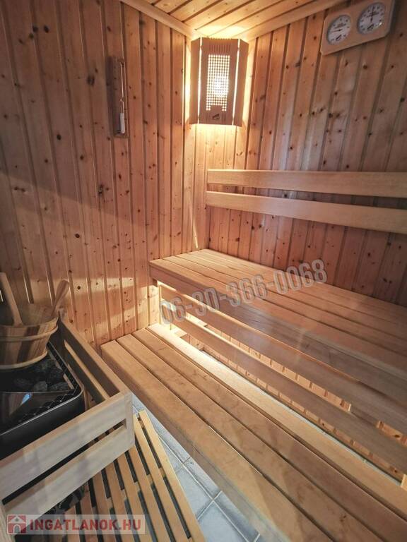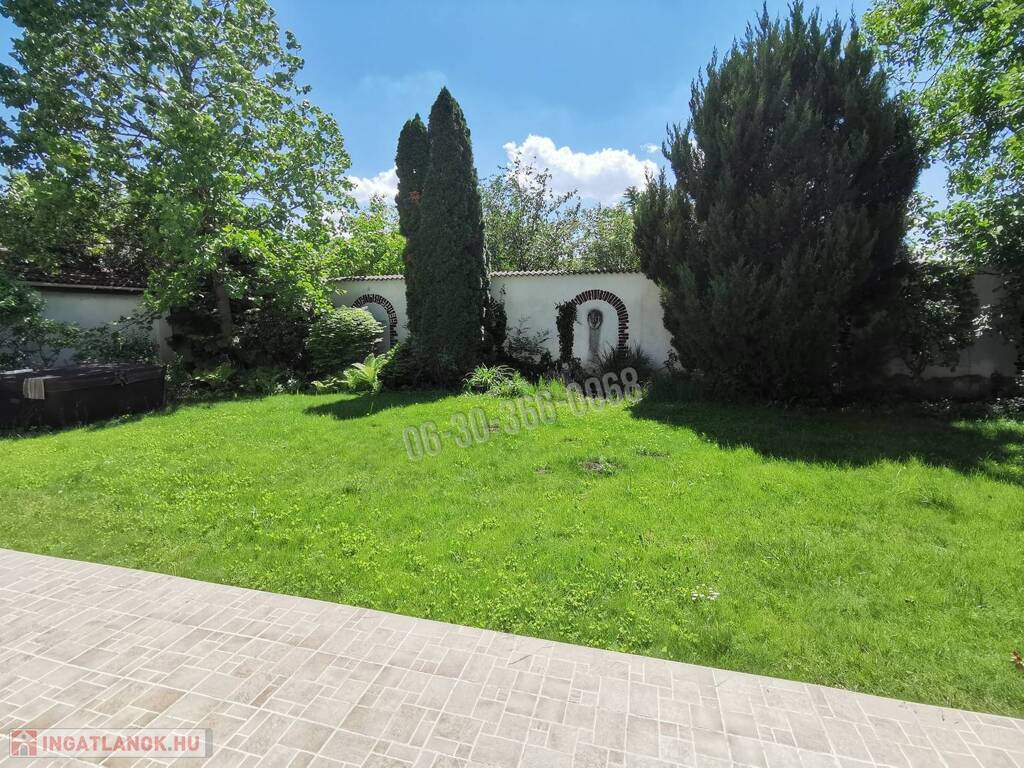 Behind the house, there is a quiet, tidy, intimate garden with a small lake, jacuzzi, and watering system, as well as a 30 square meter, south-facing terrace covered with outdoor tiles. Both sides of the house are paved with cobblestones, with flower beds and solar lighting. The house's fence, entrance and garage doors are made of wrought iron.
