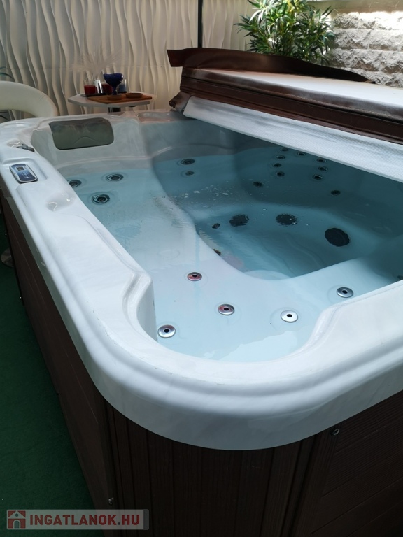 Családoknak, vállalkozóknak is ideális választás ez a ház! A kerti medence és a terasz körül 8-10 méter magas, átláthatatlan örökzöld tujasor van. Extra kényelmi felszereltség ( jakuzzi, infra szauna, solárium és fűtött kerti medence).