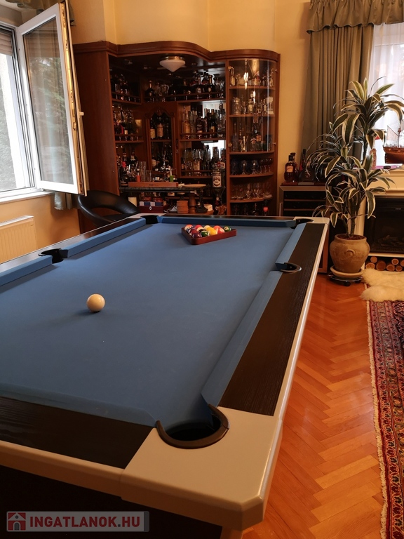 FÖLDSZINT : előszoba, konyha és kamra, étkező , nappali szoba beépített bárszekrénnyel és biliárd asztallal, a közlekedőben beépített gardrób szekrény, wc, a fürdőszobában sarokkád masszázs funkciókkal és hálószoba.