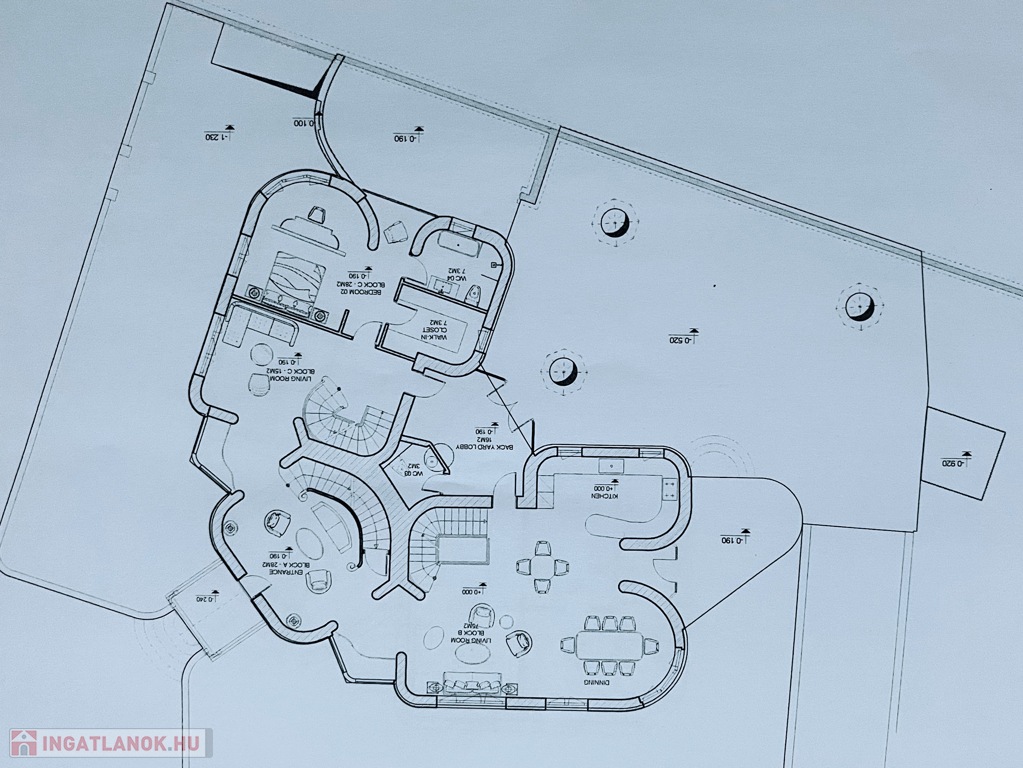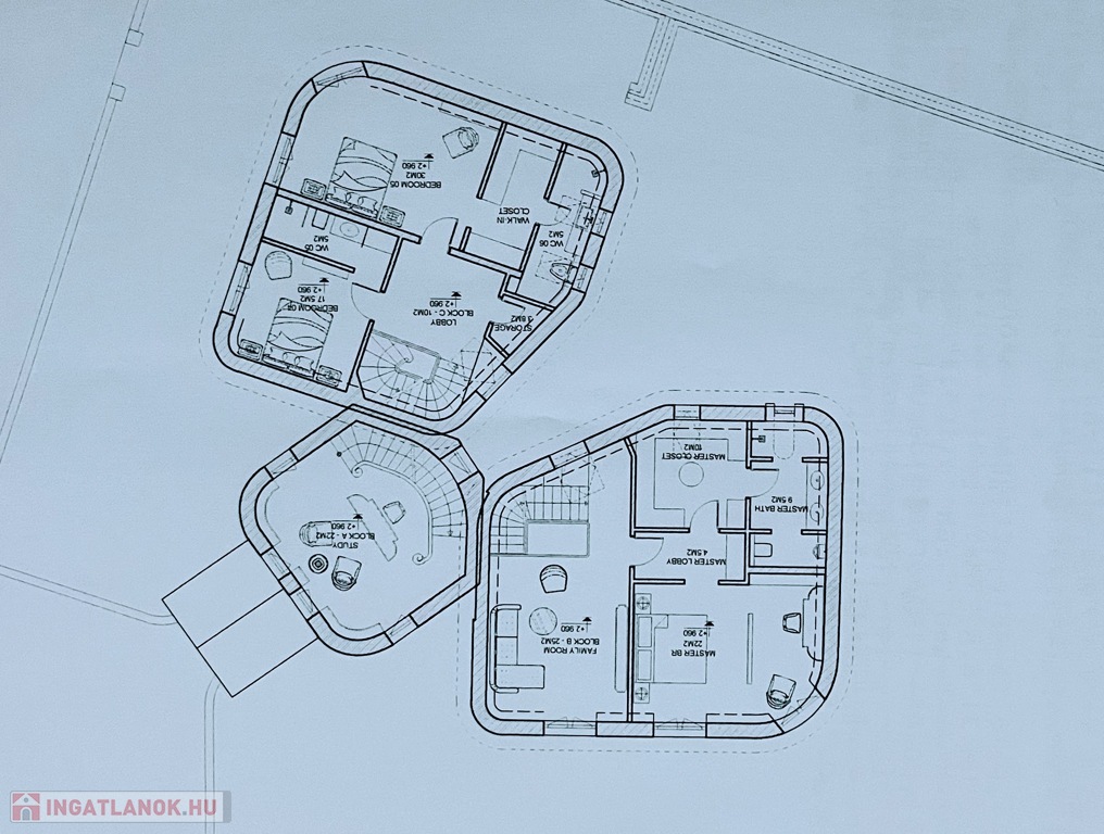 _Jobboldali tömb (3 szint): Jobb oldali lakásegység pince szinten családi szoba (házi mozi, bálterem, előadó színpad stb.) és bár vizes blokkal lett kialakítva. Ehhez tartozik egy borpince is. Földszinten kb. 85 m2 alapterületen központi Nappali + étkező + konyha áll a ház lakói szolgálatára. A egész emeleti szinten egy exclusive lakosztály kialakítására kerül (nappali + háló + gadrób + vizes blokk). A tömbhöz külön utcai bejárattal is megközelíthető.