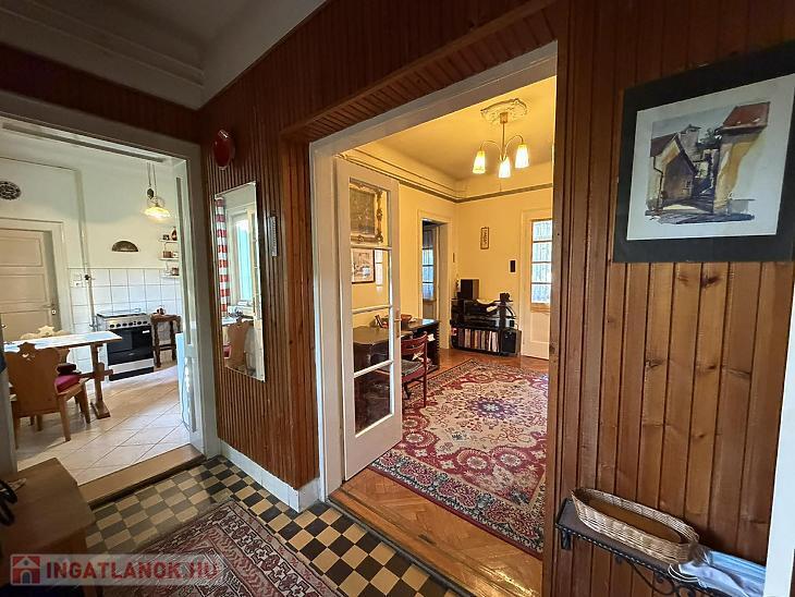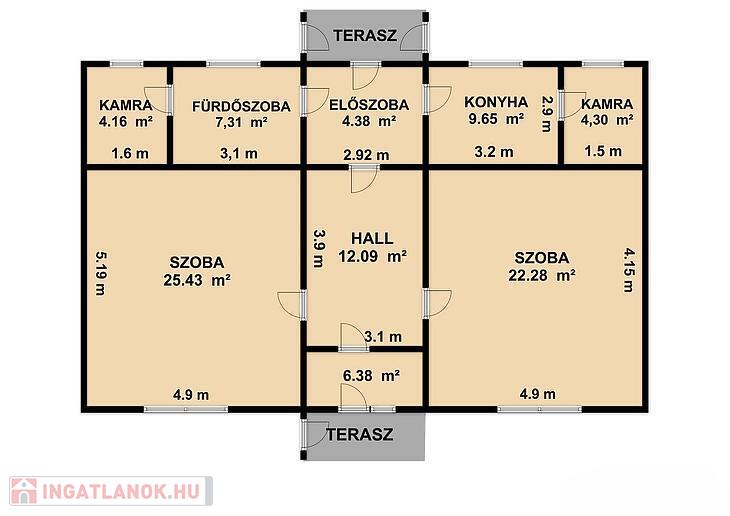 2 szoba, hall, konyha, 2 kamra, kádas fürdőszoba + WC, előszoba, 2 terasz.