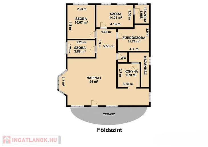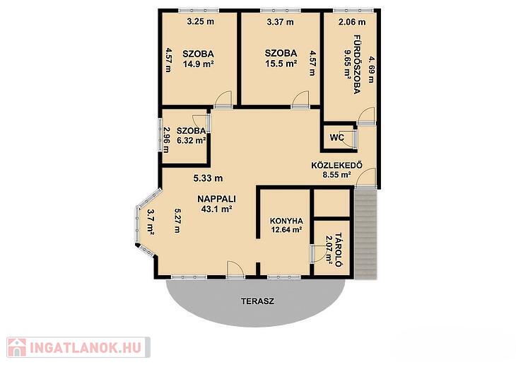 Emelet: 3 szoba, nappali, konyha, fürdőszoba, wc, tároló, terasz, közlekedő.