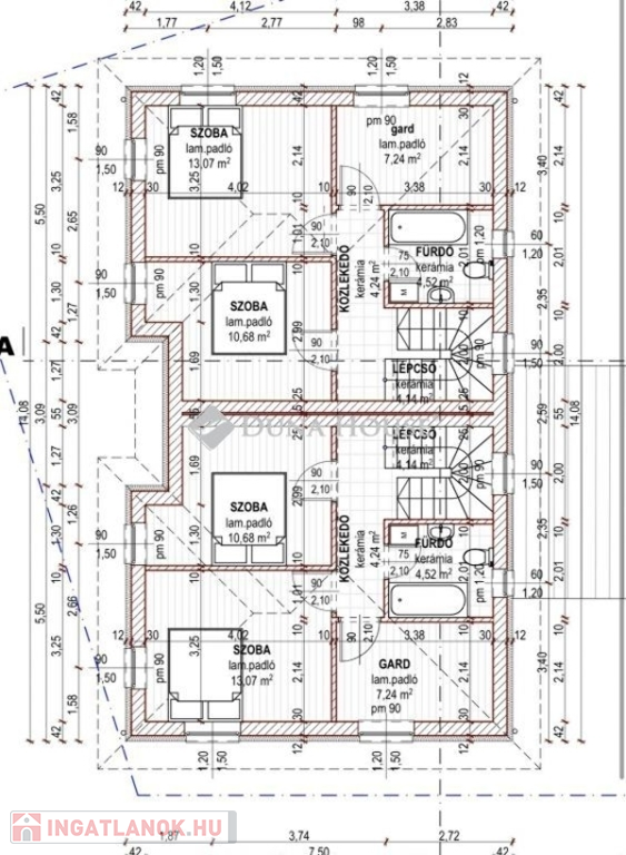 emeleten: 3 szoba, fürdő+wc, közlekedő