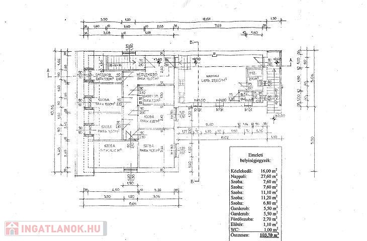 Emelet: 5 szoba, nappali, fürdőszoba, wc, 2 gardrób, előtér, közlekedő.