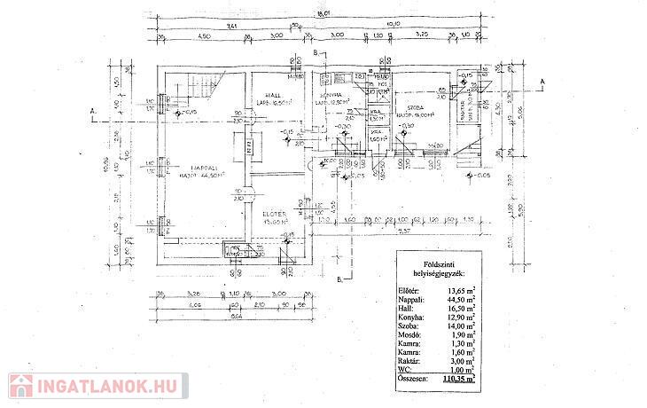 Földszint: Előszoba, hall, nappali, konyha + étkező, kádas fürdőszoba, 2 wc, 2 kamra, előtér, raktár.