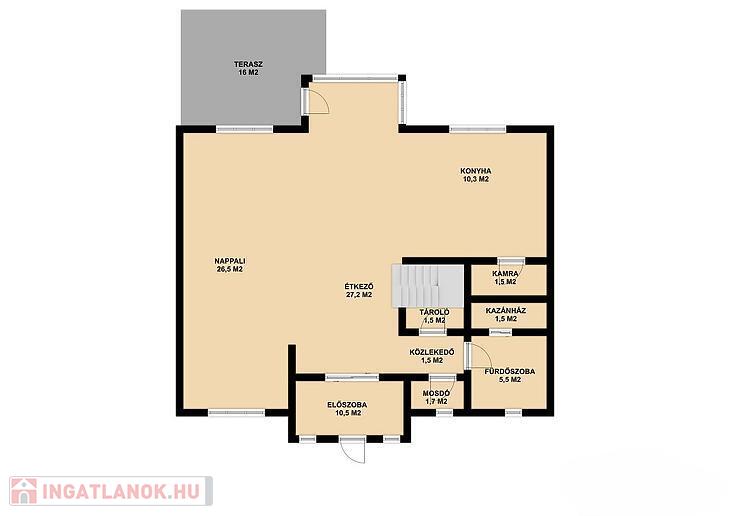 Földszint: amerikai konyhás nappali + étkező, zuhanyzós fürdőszoba, WC + mosdó, előszoba, kazánház, tároló, 16 m2-es terasz