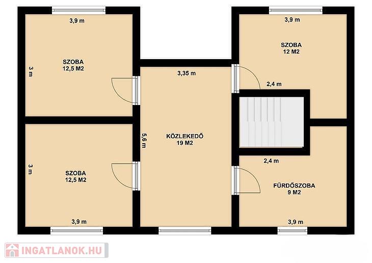 Emelet: 3 szoba, közösségi tér, zuhanyzós fürdőszoba + WC + infra szauna.