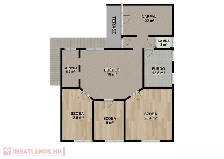 Emelet: 4 szoba, amerikai konyhás nappali, fürdőszoba + mellékhelyiség, kamra, terasz.
