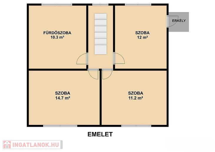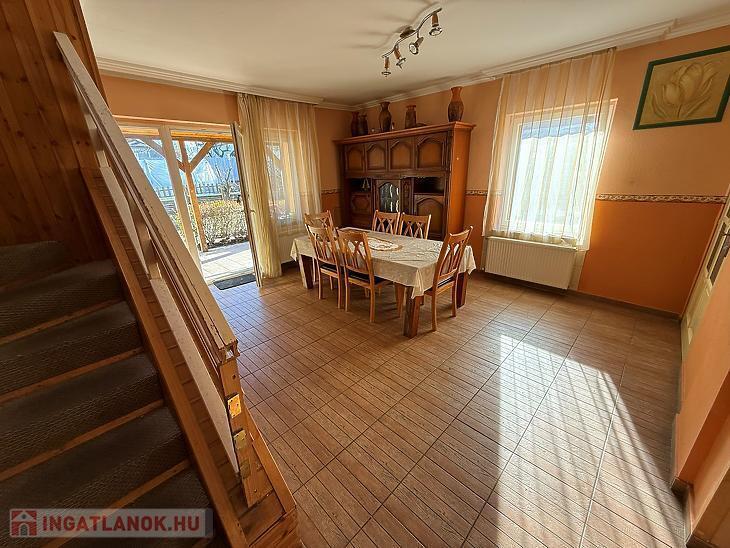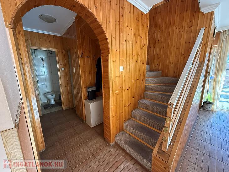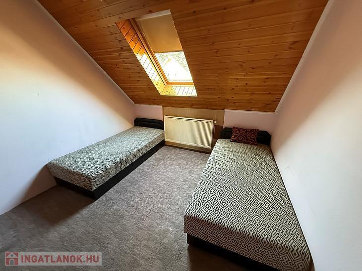 Emelet: 3 szoba, zuhanyzós fürdőszoba + mellékhelyiség, közlekedő, erkély.