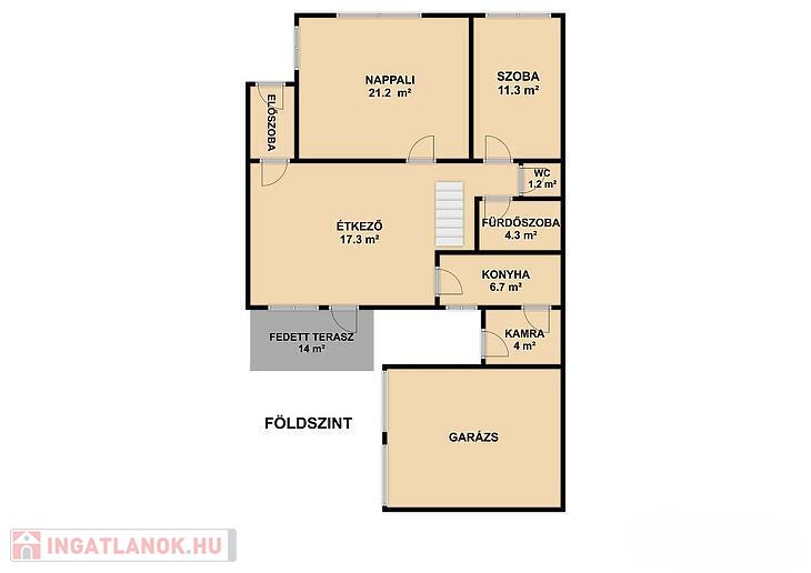Földszint: nappali, szoba, konyha, étkező, zuhanyzós fürdőszoba, mellékhelyiség, közlekedő, előszoba, kamra, 14 négyzetméteres terasz.