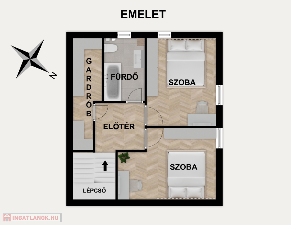 A ház emeletén 2 háló, kádas fürdő és gardrób helyiség található.