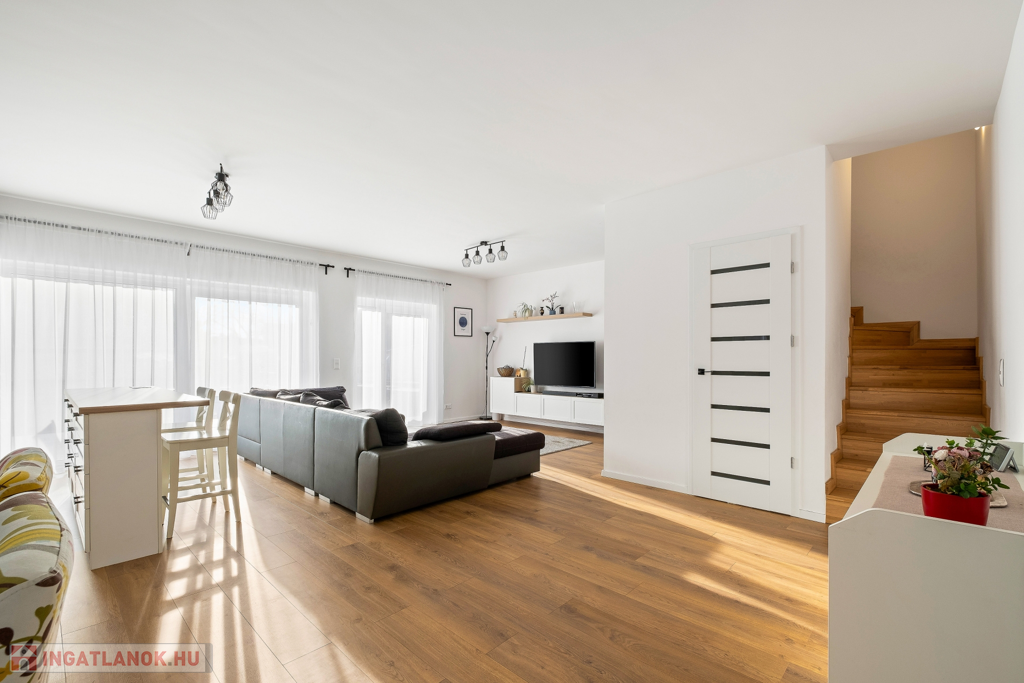 A 2 szintes ingatlan földszintjén tágas amerikai konyhás nappali teraszkapcsolattal, hálószoba, fürdő, külön mosdó, kamra, mosókonyha és garázs került kialakításra.