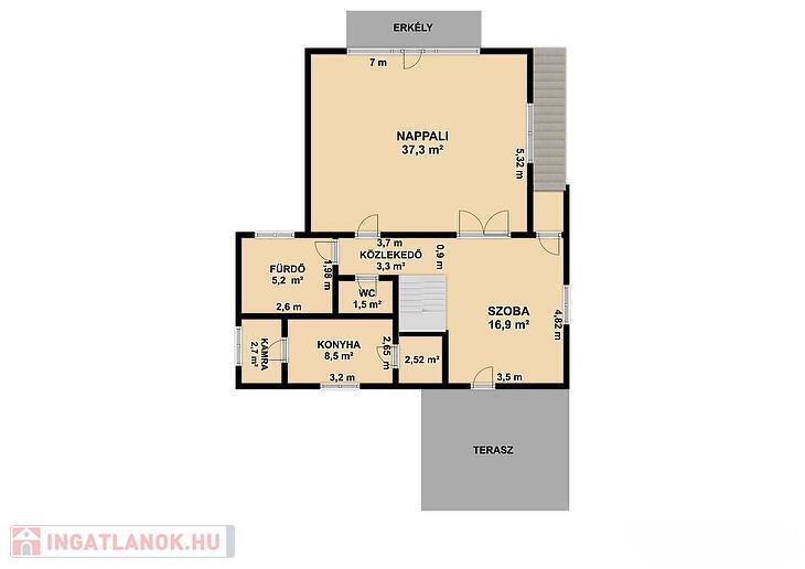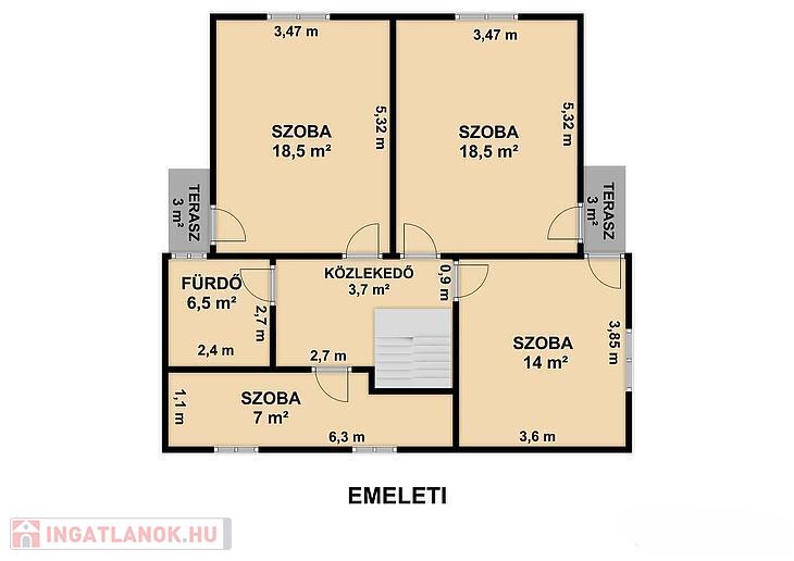 Emelet: 4 szoba, fürdőszoba + mellékhelyiség, közlekedő, 2 erkély.