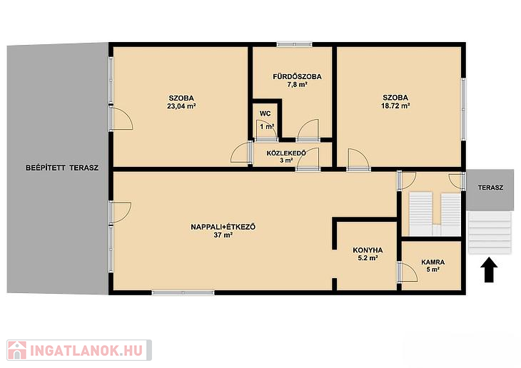 Földszint: 2 szoba, étkezős nappali, konyha, zuhanyzós + kádas fürdőszoba, mellékhelyiség, beépített terasz, kamra.