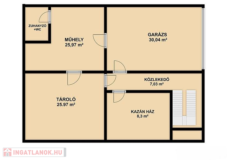 Szuterén: Kazánhelyiség, 2 tároló, zuhanyzó + mellékhelyiség, garázs.