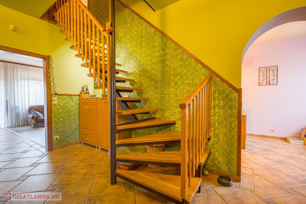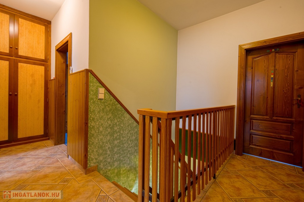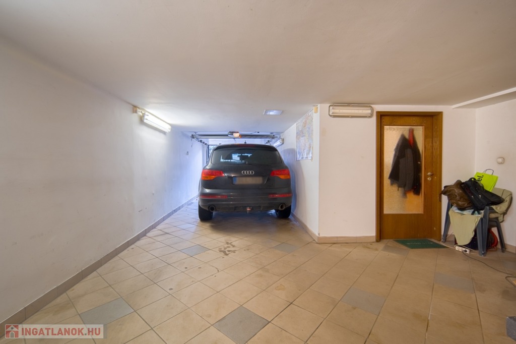 A pinceszinten nagy tároló, két állásos garázs, szauna és háztartási helyiség található, valamint a kertbe közvetlen kijárás is megoldott. A földszinten konyha, étkező/szoba, hatalmas nappali és 21 m2-es, kertkapcsolatos terasz, zuhanyzós fürdő-WC, valamint kamra, az emeleten további 4 hálószoba és egy sarokkádas fürdőszoba található.