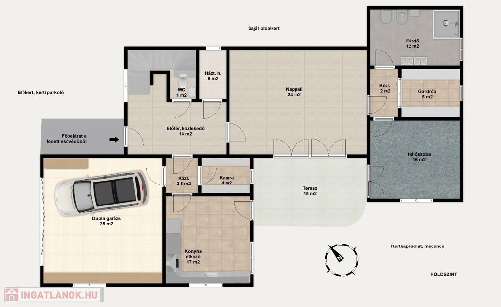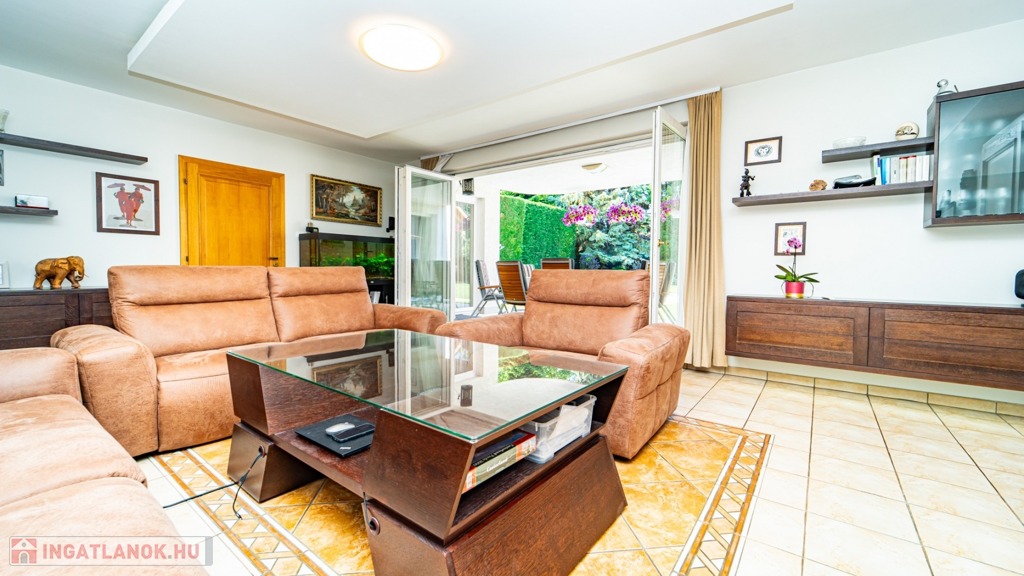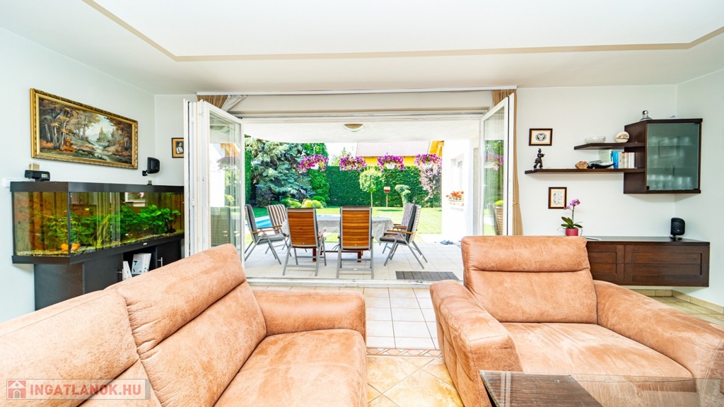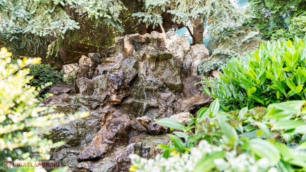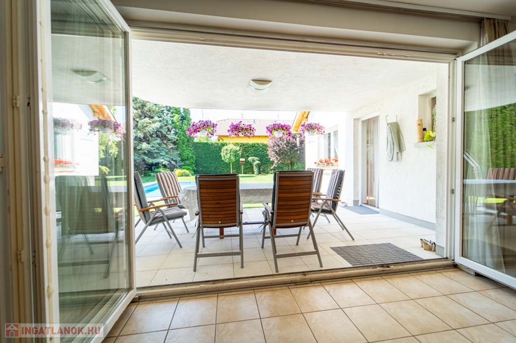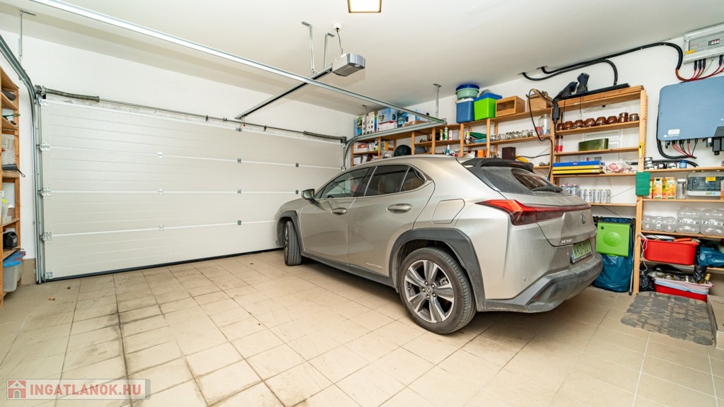 Az előkertben egy nagyméretű, akár lakóautó tárolására is alkalmas, féltetővel kialakított autóbeálló is helyet kapott. A garázs és a főkapu is elektromosan nyitható, a kertész által rendbentartott kertben autómata öntözőrendszer öntöz, a medencének is komplett vezérlése, világítása van az autómatizáláshoz, ráadásul fűthető, napkollektorról.