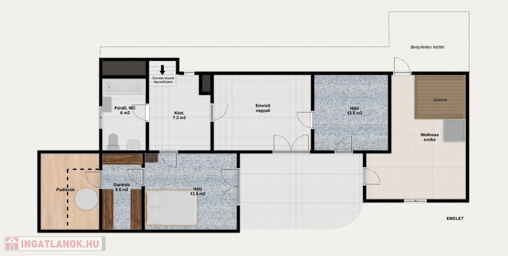 Az alsó szinten a teljes nettó lakótér 107 m2, egy 33 m2-es nappali mellett egy 16 m2-es háló + gardób és saját fürdő, 16 m2-es konyha étkezővel, kamra, külön vendégmosdó és egy 35 m2-es dupla garázs található (a teljes alapterület terasz nélkül 142 m2, a terasz plusz 15 m2), az emeleten, összesen nettó 65 m2-en 2 háló, emeleti nappali, wellnes helyiség szaunával és zuhanyzóval, fürdő, rengeteg tároló és gardróbhelyiség, valamint egy 12 m2-es, déli fekvésű erkély.