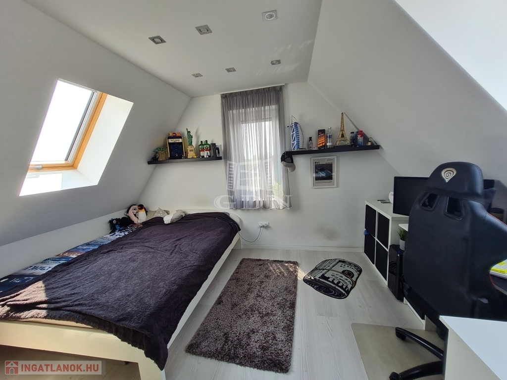 A kiskapu és a nagykapu távirányítású. A garázs mellett, kerten belüli parkolás is megoldott.