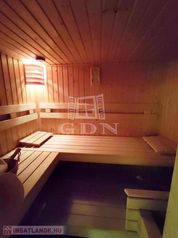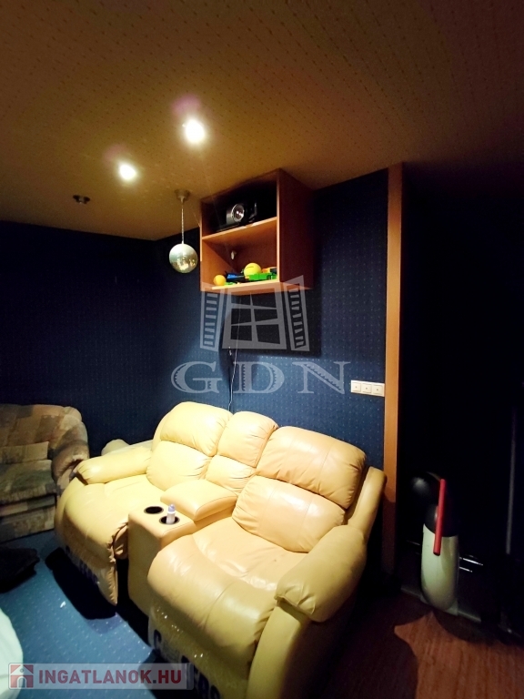 Az alsó szinten helyezkedik el a dupla GARÁZS tárolóval és gépészeti helyiséggel, továbbá egy WELLNESS-részleg jacuzzival, szaunával, infra szaunával és fürdőszobával. A MOZISZOBA vászonnal, projektorral és kényelmes bőrfotelekkel felszerelt.