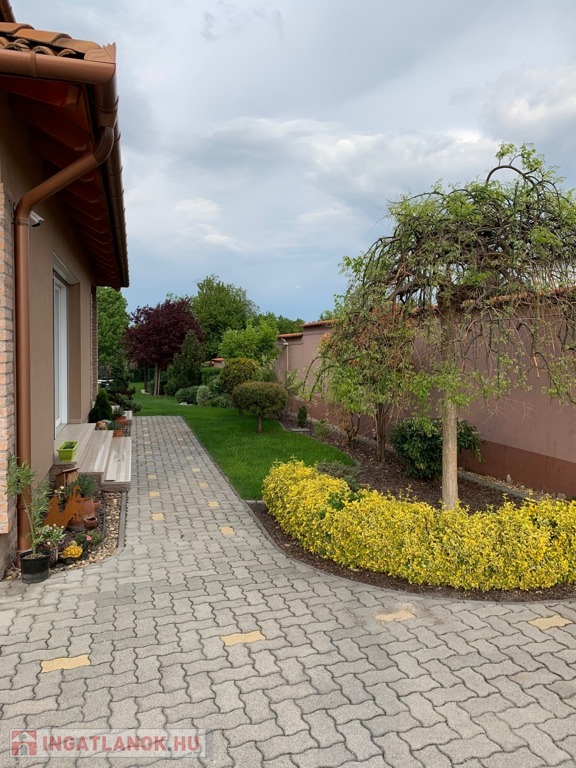 A csendes mellékutcából, kovácsoltvas elektromos működtetésű kapun keresztül a terjedelmes, térkővel burkolt előkertbe érkezünk, innen tárul elénk a 2011-ben épült, egyedi stílusú családi ház.