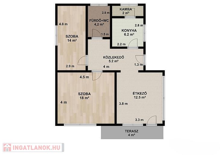 2 szoba, étkező, konyha, fürdőszoba + mellékhelyiség, kamra, terasz.