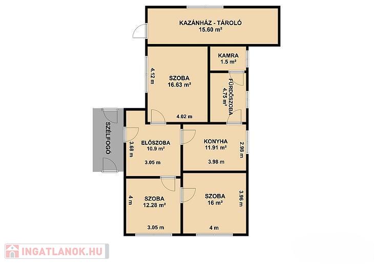3 szoba, konyha, kamra, fürdőszoba + wc, előszoba, kazánház, fedett terasz.