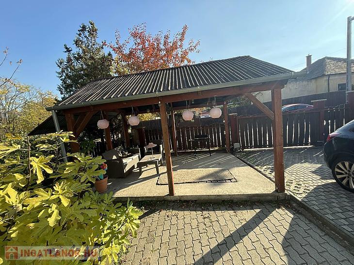 A rendezett telken egy fedett gépkocsibeálló is található.
