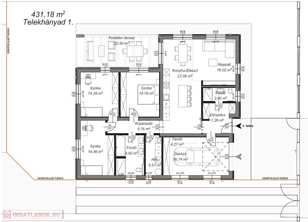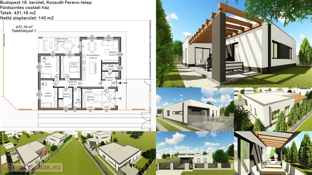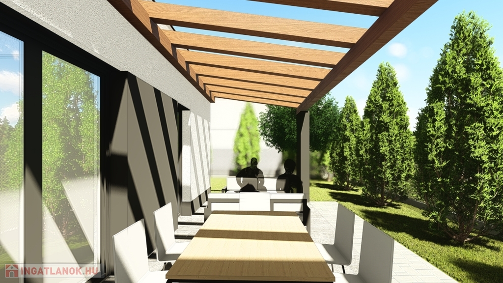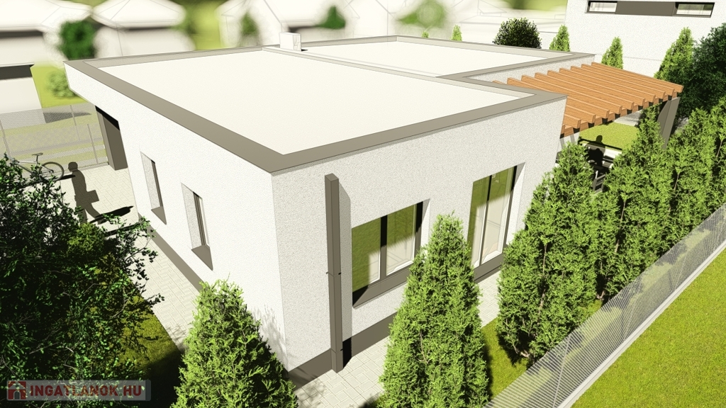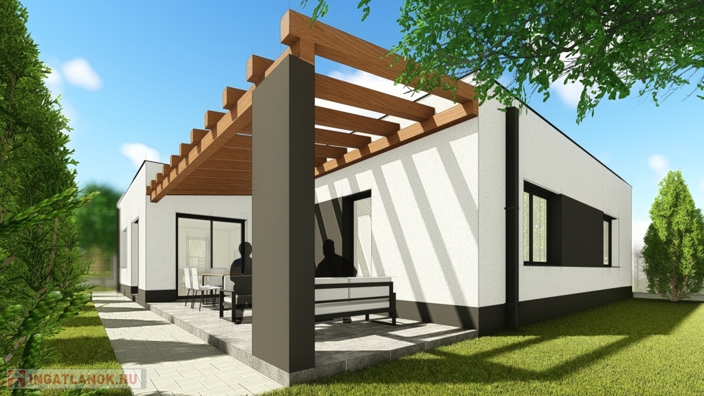 Az épület elején a bejárat és egy garázs kap helyet, a garázsból is van egy bejutási lehetőség az előszobához. Az épületben két fürdőszoba, egy háztartási helyiség is helyet kap, sok tárolási lehetőség biztosítható. A közlekedőről nyílik minden helyiség, így nem zavarja a nappali zaja a nyugalmat. Az épület 3 db 14 m2-es hálószobával rendelkezik. A nappali és a konyha-étkező egy légtérben helyezkedik el 43 m2-en, ahonnan ki lehet jutni a 22 m2-es, pergolával árnyékolt, modern megjelenésű kertkapcsolatos teraszra. A nappali terek nagy ablakokkal vannak ellátva, így kellő fényt biztosítva, a pergolával árnyékolt terasz mégsem engedi be a nyári forróságot. A szobák is nagyobb ablakokat kaptak, így biztosítva a szükséges mértékű természetes fényt. Az épület lapostetős, modern kialakítással épül egy folyamatosan frissülő és fejlődő környezetben.