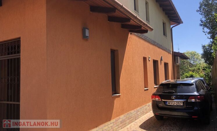 A kert maga igazi zöld oázis: az automata locsolórendszer nemrégiben került felújításra, a korábbi tujasor helyére babérmeggybokrok kerültek, amelyek jól tűrik a mediterrán jellegű klímát, így a kerítés mentén egész évben gondozott, zöld látvány fogad. Az udvart új, modern válaszkerítés határolja az ikerszomszéd felé, a kert többi részét körülölelő fakerítés pedig tavaly friss festést kapott. A kerti tárolásról egy kis faház gondoskodik, amely tökéletes kerékpárok, kerti szerszámok vagy gyerekjátékok elhelyezésére. Az udvar térkövezett részén akár három autó is kényelmesen parkolhat egymás mögött, elektromos kapu biztosítja a gyors ki- és bejutást.