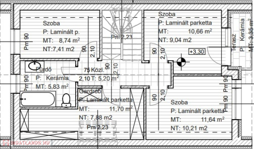 A három szintes otthonhoz tartozik egy 57,81 m2-s garázs, tároló, gépészet, elektromos garázsajtóval, 24,86 m2-s terasz, és egy 3,81 m2-s erkély. A nettó 53,5 m2 -es Földszinten egy tágas amerikai-konyha nappali, zuhanyzó, külön mosdó, hálószoba, közlekedő, előszoba, a nettó 45,57 m2-es emeleten 4 hálószoba, melyből az egyik beépített gardróbbal kialakított, fürdő-mosdóval, közlekedő található. A 3,35 m2-s erkélyre az egyik hálószobából tudunk kijutni.