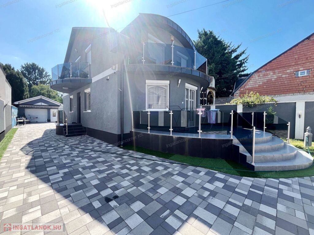 Eladó luxus ikerházfél medencével, több terasszal és teljesen felszerelt kerti konyhával Pest-Lőrinc egyik legkedveltebb utcájában!