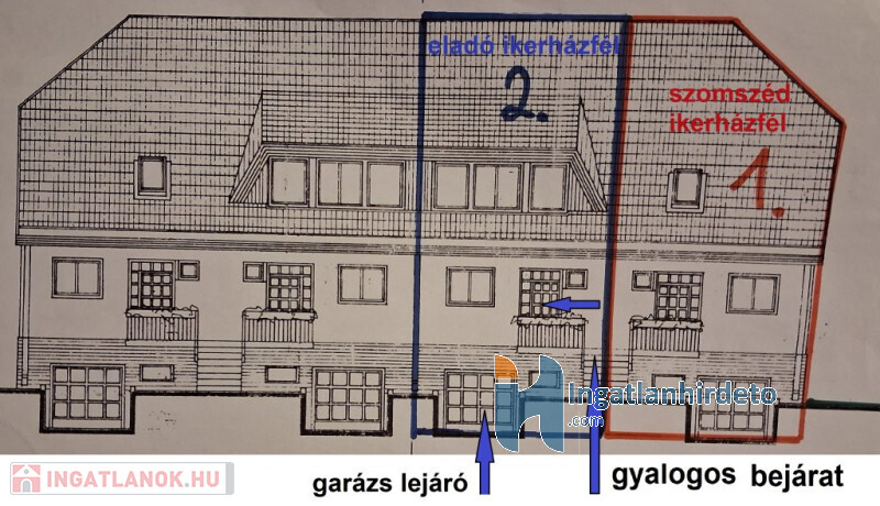 Az eladó ikerházfél egy helyrajzi számon van a szomszédos másik ikerházfél résszel, melyet ügyvéd által ellenjegyzett használati megállapodás szabályoz (külön közművek, mérőórák, saját kert).