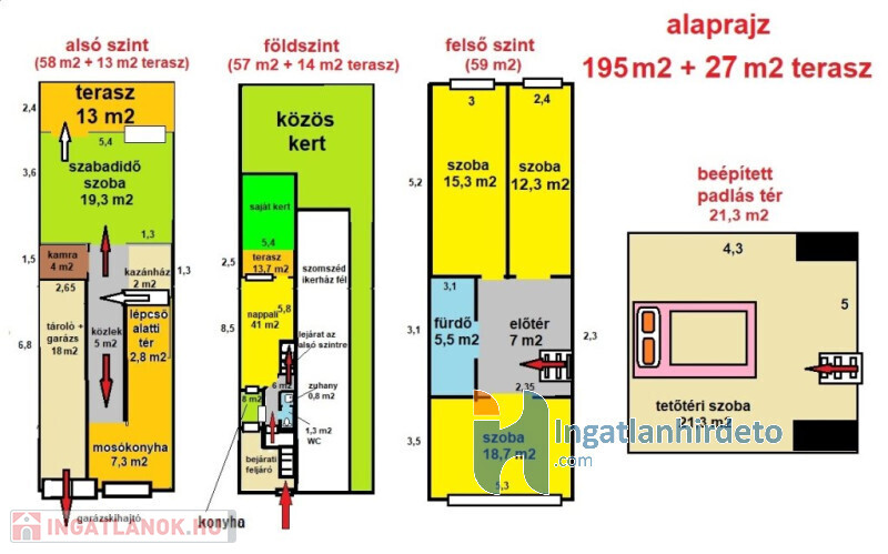 Az ikerházfél 195 m2-es + 2 db 13 m2-es terasz és külön KERT tartozik hozzá.