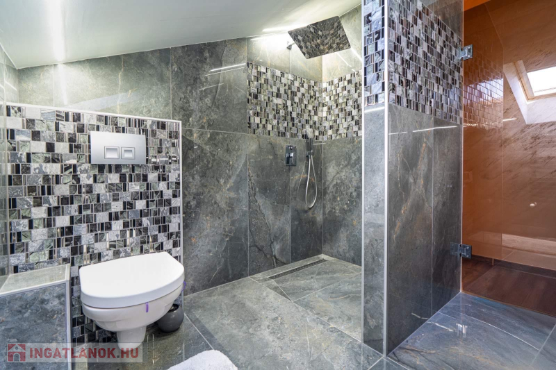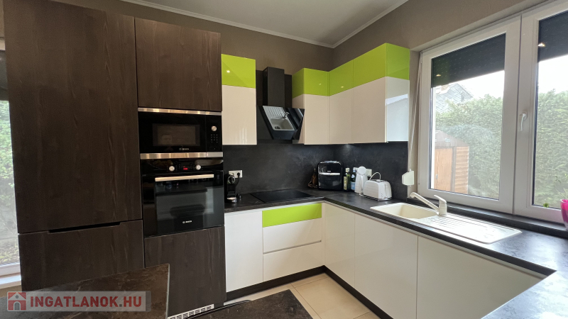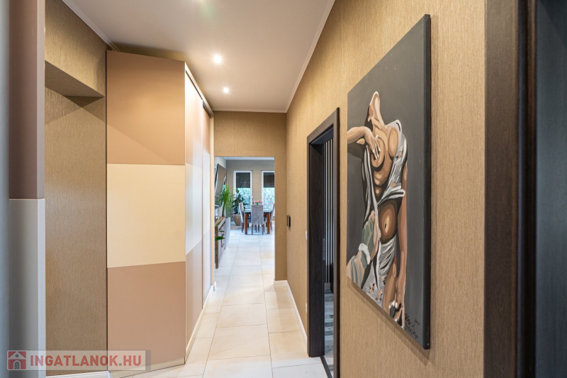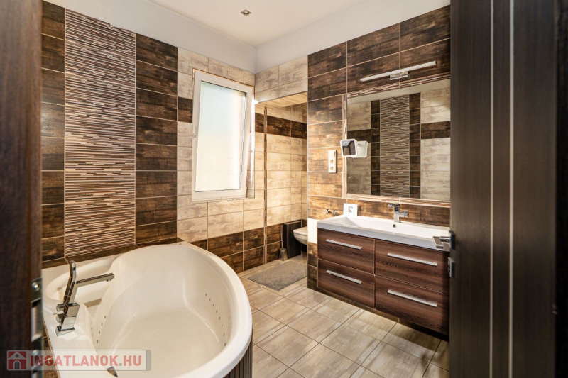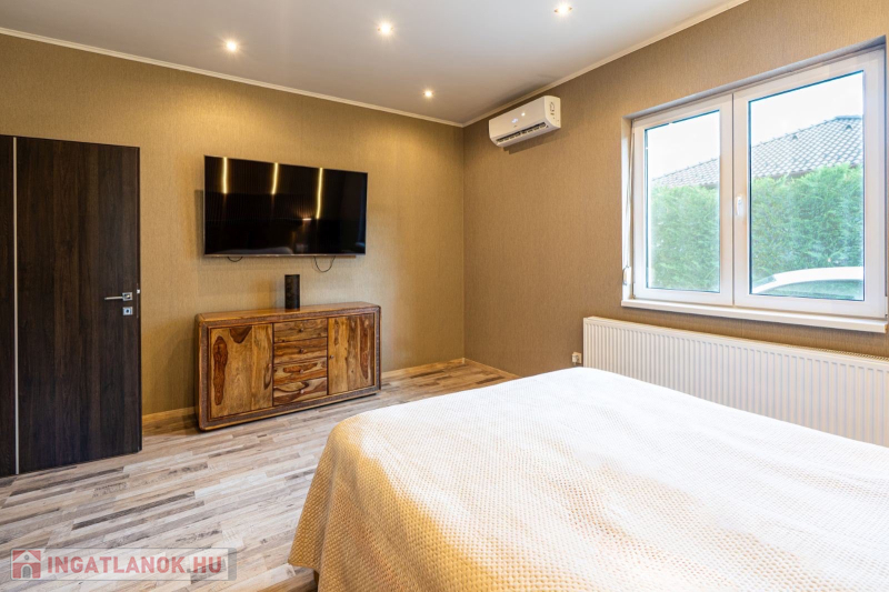 Műszaki:Főfalak 30-as porotherm tégla,válaszfalak 25 cm , fűtés kondenzációs cirkó 32 KW, radiátor és padlófűtés, 3 rétegű hőszigetelő üvegezésű kívül színes bukó-nyíló nyílászárók, 10 cm-es dryvit szigetelés, riasztó ,alumínium redőny ,szúnyogháló beépítés , hűtő-fűtő klímák több helyiségben, padlófűtés, elektromos kapu és garázskapu, cserépfedés,térkövezés,kerti faház (9 m2), öntöző rendszer, hőszivattyúról fűthető medence( 6 x 3méteres), fénytechnika,kerti világítások,fedett terasz,kerti bútorok,sütögető, 9 db tv a házban (47colos-75colos), wellness részleg 6 fős finn szauna zuhanyzóval .
