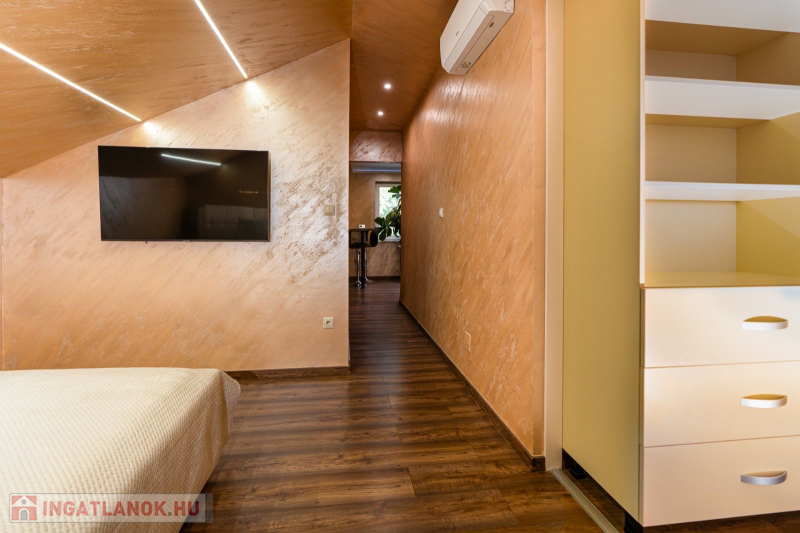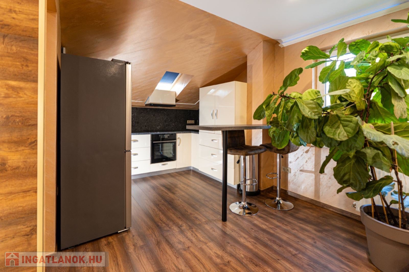 Az ingatlan teljes berendezéssel eladó, mindkét szinten beépített konyhabútor , beépített gépekkel, 3 darab beépített gardrób szekrény,fürdőszoba szekrények,álmennyezet ,spot világításokkal, fényterápiás fürdőkád ,étkező asztal, ágyak ,nappali bőrgarnitúra stb..