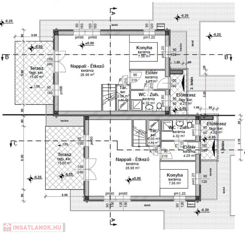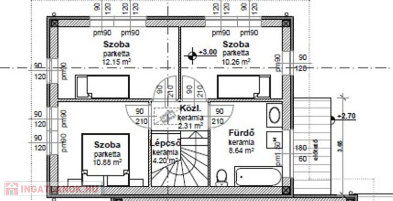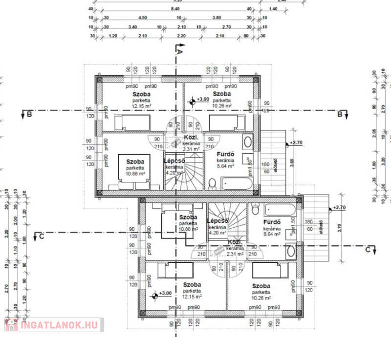 Műszaki:Vasbeton sávalap, dupla fal a lakások között , 30-as Porotherm tégla teherhordó falak, 10-es Porotherm válaszfalak, vasbeton közbenső és fa emeleti födém. A külső falak 12 cm-es Dryvit hőszigeteléssel, az emeleti födém 30 cm-es (fújható cellulóz )hőszigeteléssel készül, cserép héjazással. Nyílászárók(Schüco típusú ) 3 rétegű hő- és hangszigetelő thermo üveggel, kívül,belül fehér színben. Fűtés és a meleg víz hőszivattyúról H tarifával, mindenhol padlófűtés . 1 darab hűtő -fűtő klíma 3,5KW-os nappaliban , összesen 5 db. klíma kiállás a hálószobákban,nappaliban, lépcsőházban.