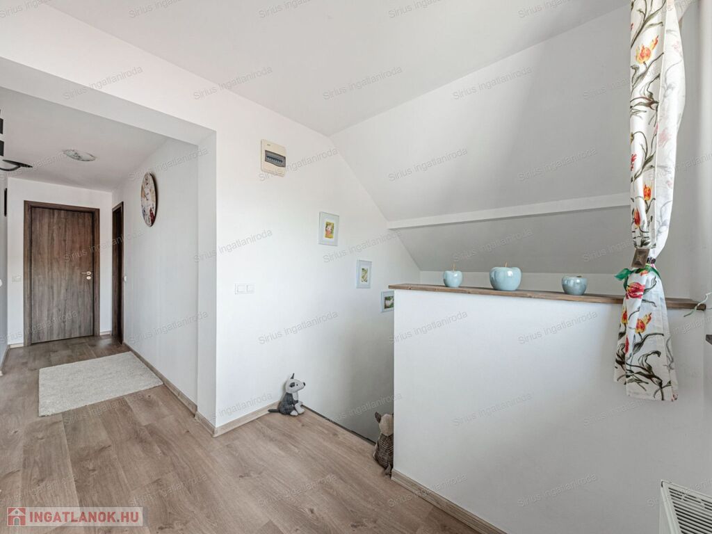 A HÁZ ELOSZTÁSA A TÖKÉLETES CSALÁDI OTTHON KÉNYELMÉT BIZTOSÍTJA: földszintjén világos amerikai konyhás nappali, szülői háló, fürdőszoba és tároló, az emeleten pedig kettő hálószoba, fürdőszoba és egy mosókonyha található.