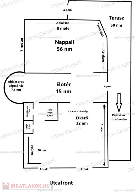 -Földszint (kb108 m²): Nappali (50nm²), konyha + étkező (40nm²), fürdőszoba, spejz, közlekedő, lépcsőház