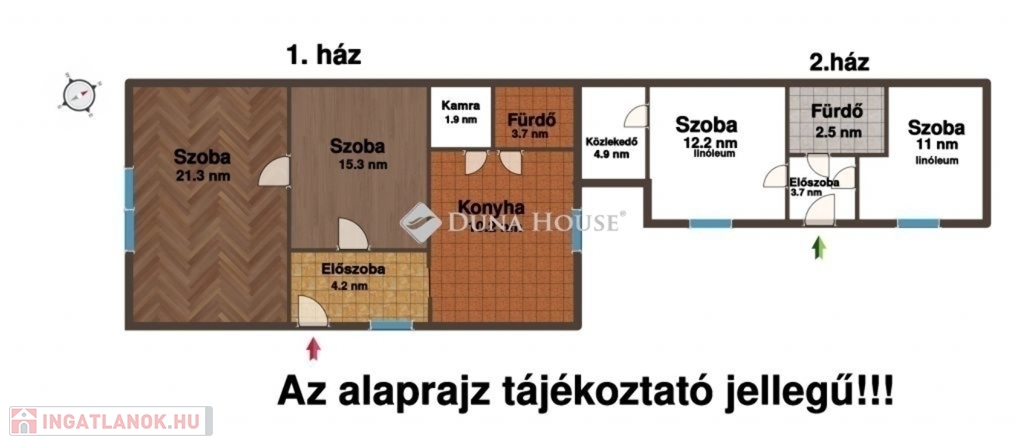 Elrendezése: Előszoba, két szoba, zuhanyzós fürdő toalettel és egy közlekedő, amely az első házzal köti össze. Itt be lett építve az ajtó amely bármikor ki szedhető és össze nyitható a két ingatlan.
