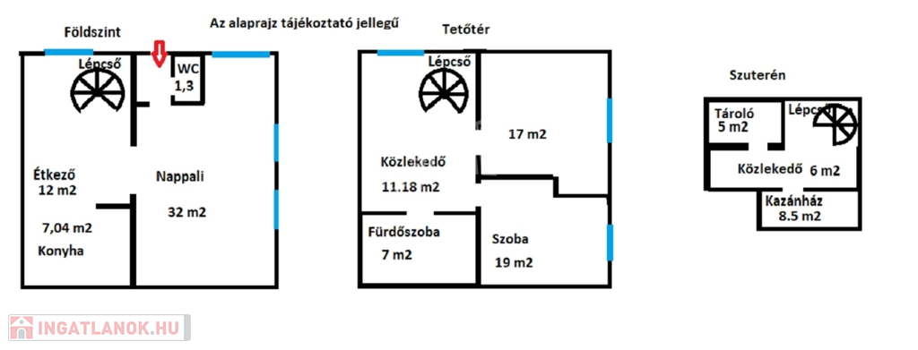 A 105 négyzetméteres ingatlan, két szinten, három szobával, rendelkezik. A ház alatt szuterén tároló található, ahol helyet kapott a gázkazán.