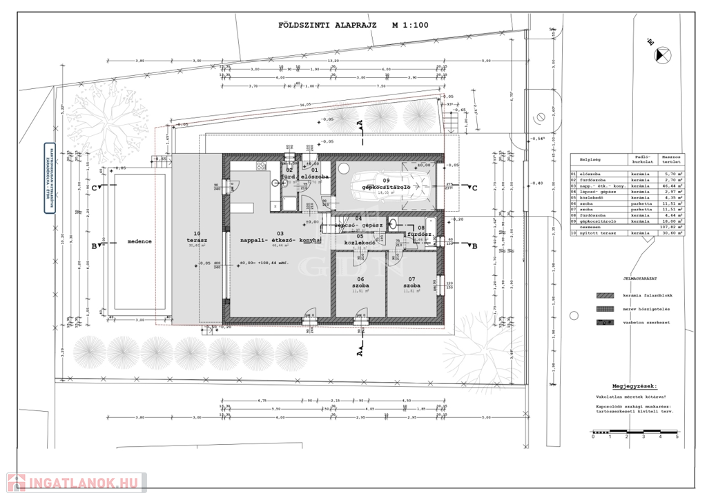 •Szerkezet: Monolit vasbeton sávalap (C20-as betonminőség), 30 cm-es szigetelésű betonfödémmel, homlokzati fal 15 cm-es, lábazatra 10 cm-es hőszigetelés kerül felhelyezésre.